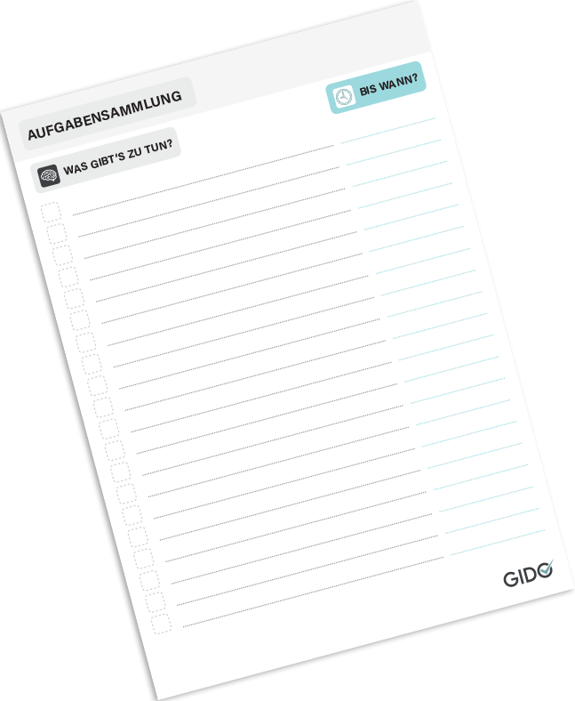 Alltagsstress und Blätterchaos gehören ab jetzt der Vergangenheit an, denn GIDO hilft dir, deine Gedanken und Aufgaben zu ordnen, ganz nach dem Prinzip der Braindump Methode.